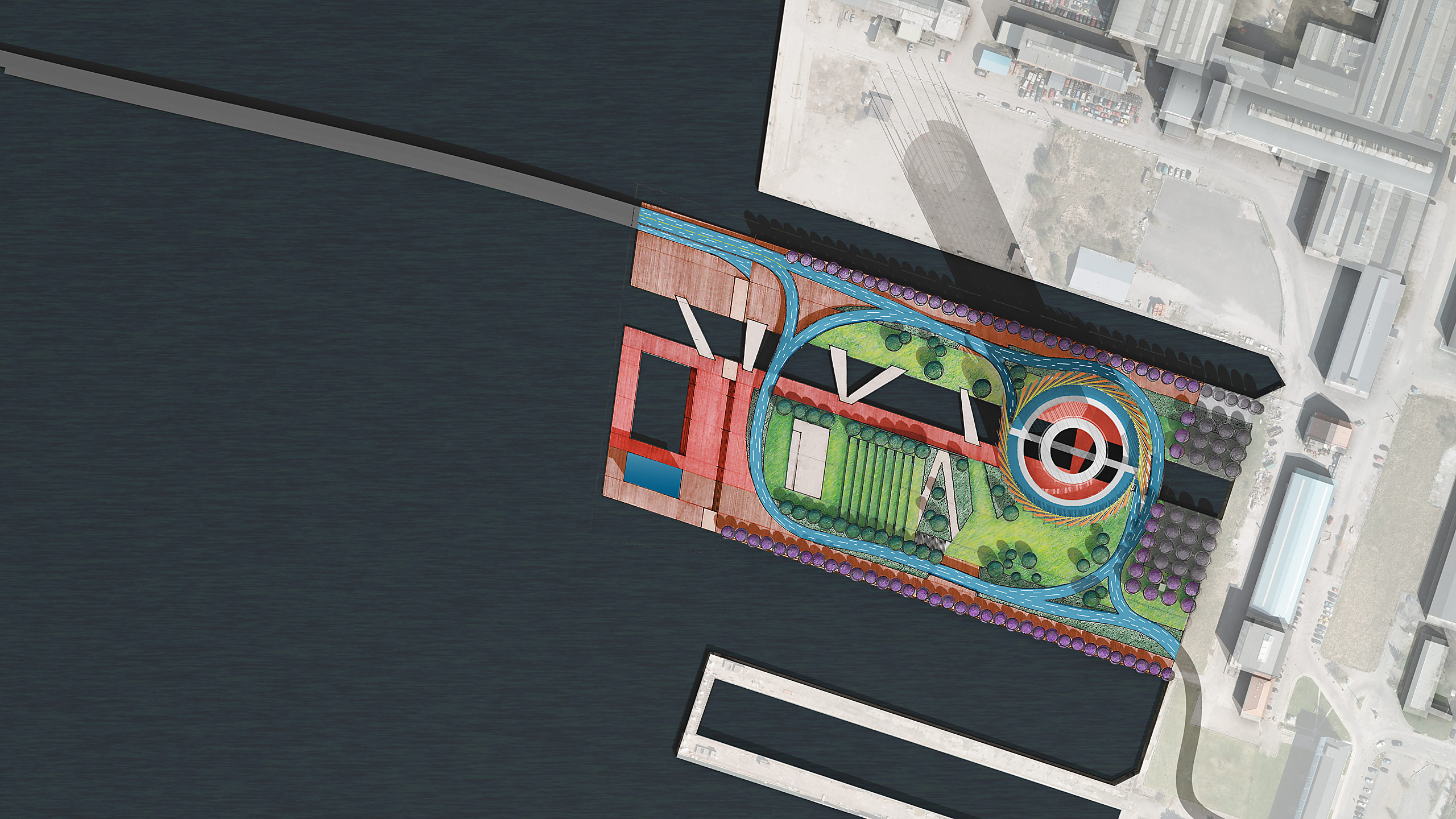 This competition proposal encompasses the development of a new waterfront park in Copenhagen on a former maritime industrial site in the Refshaleoen District. The program calls for the creation of inhabitable public space and the integration of cultural and recreational activities with sustainable and energy generating technologies that will create a model for positive power generation combined with public art and public interaction. The goal is to create demonstrable techniques to generate power in the public realm that also garner broader cultural appeal, and have applicability toward Copenhagen’s goal of carbon neutrality by the year 2025.
